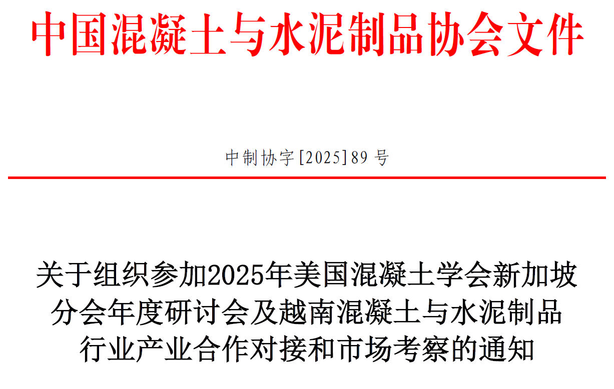 为助力我国混凝土与水泥制品企业拓展东盟市场,中国混凝土与水泥制品协会拟于2025年11月中旬,组织会员企业及相关单位赴新加坡、越南,开展混凝土与水泥制品行业产业合作对接和市场考察,深入了解当地产业发展现状、市场需求、经贸投资机遇,拓展国际合作渠道,推动产业类合作项目加速落地。现将有关事宜通知如下: