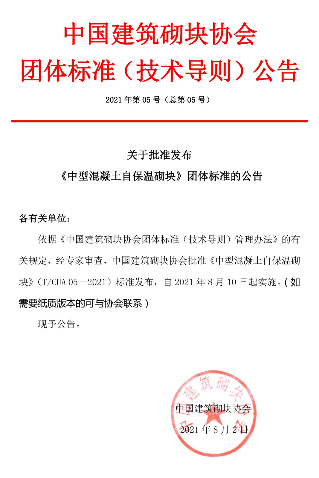 - 关于批准发布 《中型混凝土自保温砌块》团体标准的公告 2026-01-16