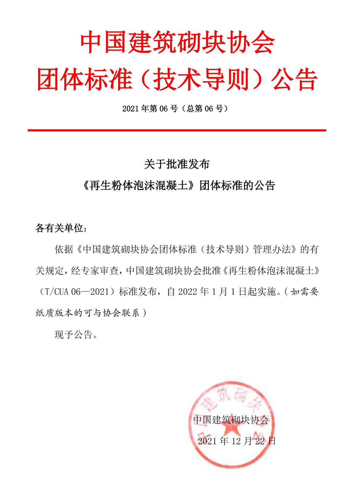 关于批准发布 《再生粉体泡沫混凝土》团体标准的公告