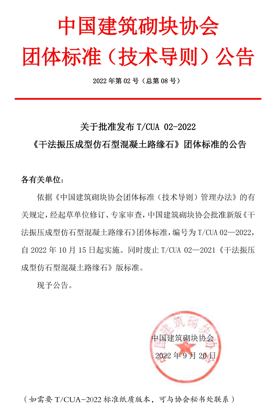 - 关于批准发布T/CUA 02-2022 《干法振压成型仿石型混凝土路缘石》团体标准的公告 2026-01-16