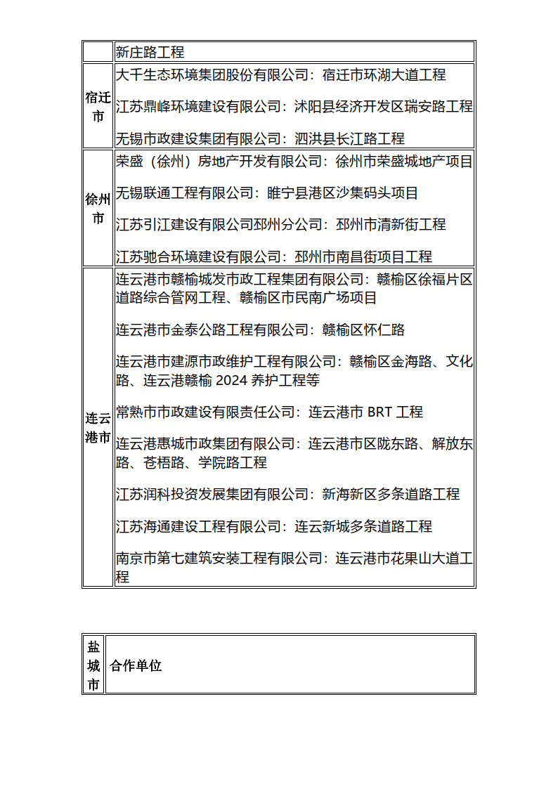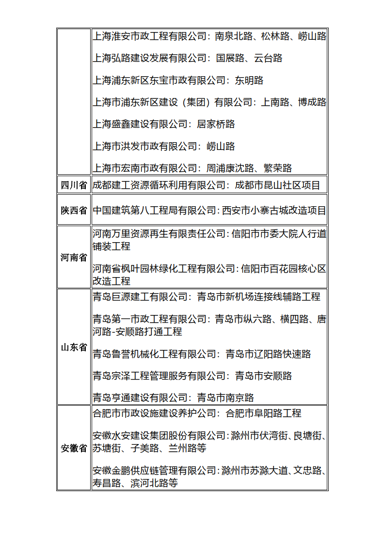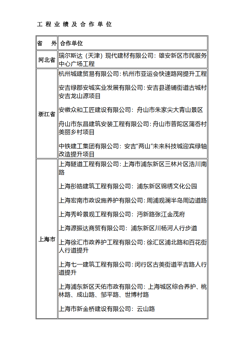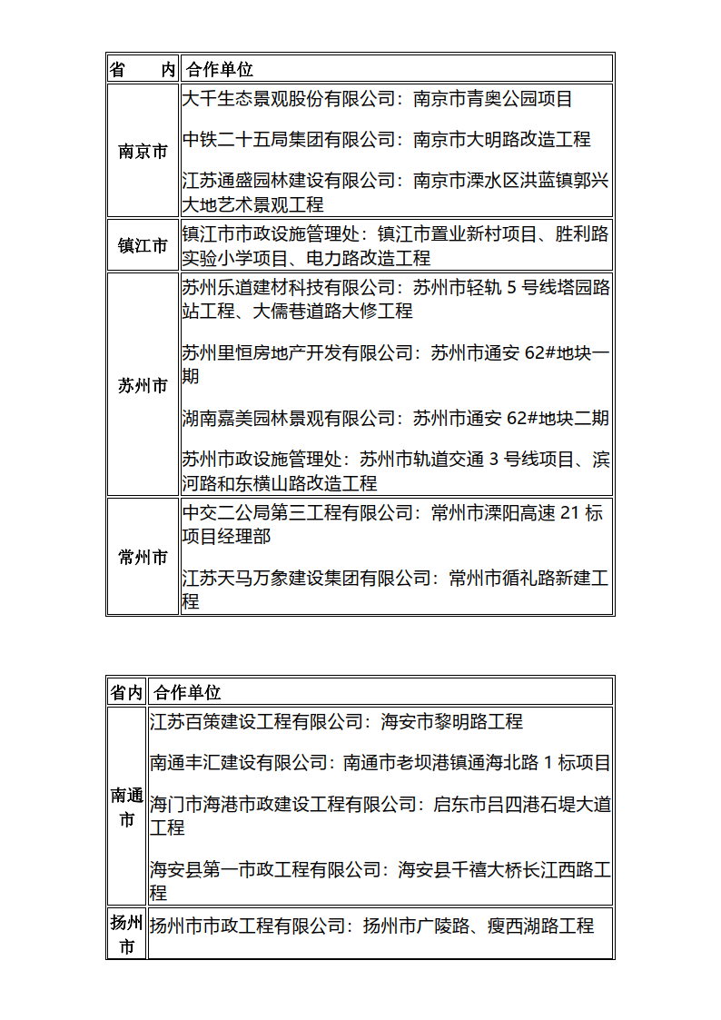近年来产品服务的典型案例有:上海浦东新区上南路全要素精细化示范工程、浦东新区锦绣公园周边道路及世博村路改造提升工程、舟山市蒲岙美丽乡村示范工程、杭州亚运会快速路网提升工程、雄安新区市民服务中心广场、西安小寨古城改造;连云港赣榆区市民广场、扬州宝应县老东门商业广场;盐城市区文港路、盐龙体育公园、盐城高铁站站前广场和湿地公园、东台经开区邻里中心广场等。