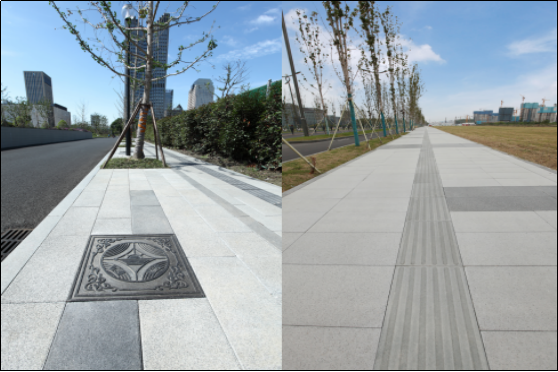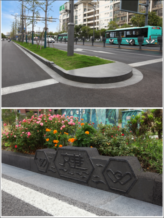 随着城市道路宽度的扩展,行人通过人行道的距离也相应加长。整体端头的使用,让原本绿化带的两端成为可供行人驻足等候的地方,此种改观,既可缓解行人的通行压力,更加彰显城市建设的人文精神。