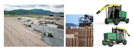 研发的欧码仕全套道路砌块机械化铺装设备(图一,图二,图三,图四,),包括“全液压智能铺砖机”“履带自行式真空吸运铺设路缘石/砌块设备”,“中小型真空吸运设备”“可作为属具安装在通用挖机装载机的真空吸运机”等是目前国内自主研发的第一个智能机械化道路砌块铺装设备,彻底颠覆了国内目前完全依靠体力铺设路面混凝土砌块/天然石材的高强度作业、低效率产出现状,解决了铺装行业的一系列痛点,填补了国内机械化铺砖及道路块材真空吸运机械的空白。目前全套产品已正式投放市场,在北京,上海,深圳,广州,成都,内蒙等城市的铺砖工地上大显身手,获得市政行业领导专家及用户的好评。在2020年新冠疫情爆发高峰期欧码仕智能铺砖机还应邀参与了北京小汤山医院改造的铺砖项目,2月15日/16日夜以继日不间断施工,2台铺砖机实现2天共计40小时完成2500平方米步道砖铺设任务,用机械化铺装效率,展现中国速度,助力新冠抗疫之战!要知道按照常规的人工铺设计算:按平均铺设效率为30m²-50㎡/ 2工日来计算,大约需要160工日,如果按照业主方2天的施工时间要求并结合当时疫情限制,几乎是不可能完成的任务。然而采用机械化铺装,这些可以轻松应对,机械铺砖机具有单机600-1000m²/天的超级施工速度,且较人工铺砖核算单价25-40元/㎡,机械化铺砖核算单价仅为8-10元/㎡。